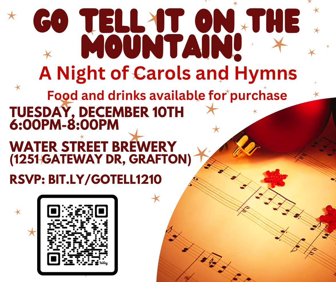 Here is a fun event— it’s a Carol and Hymn-sing at Water Street Brewery in Grafton — what a joy filled evening! RSVP is encouraged to make sure we have enough seating, click here to RSVP. Festive wear is encouraged!
