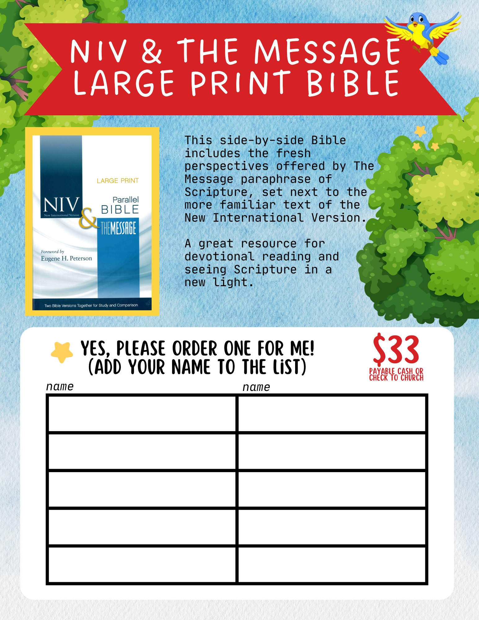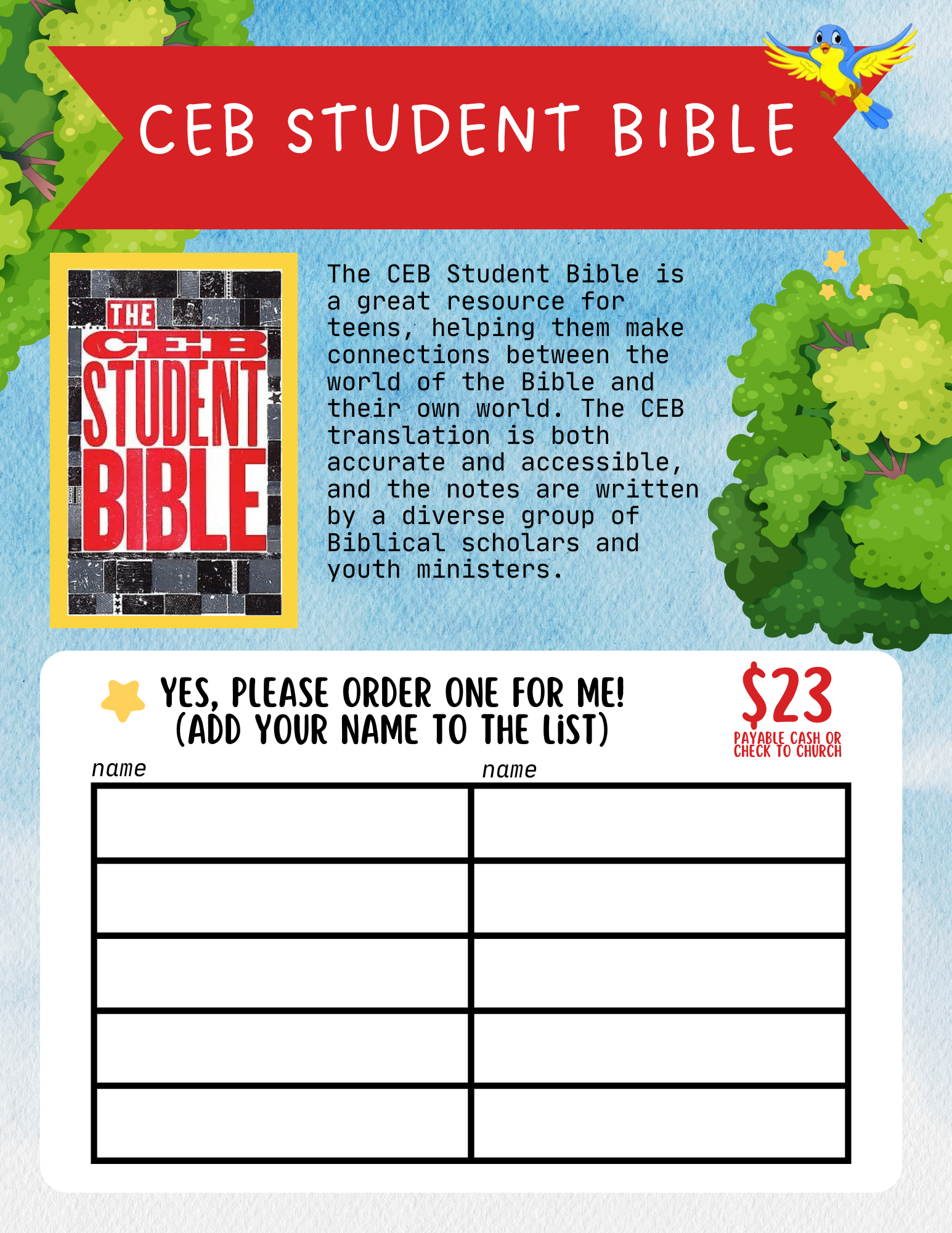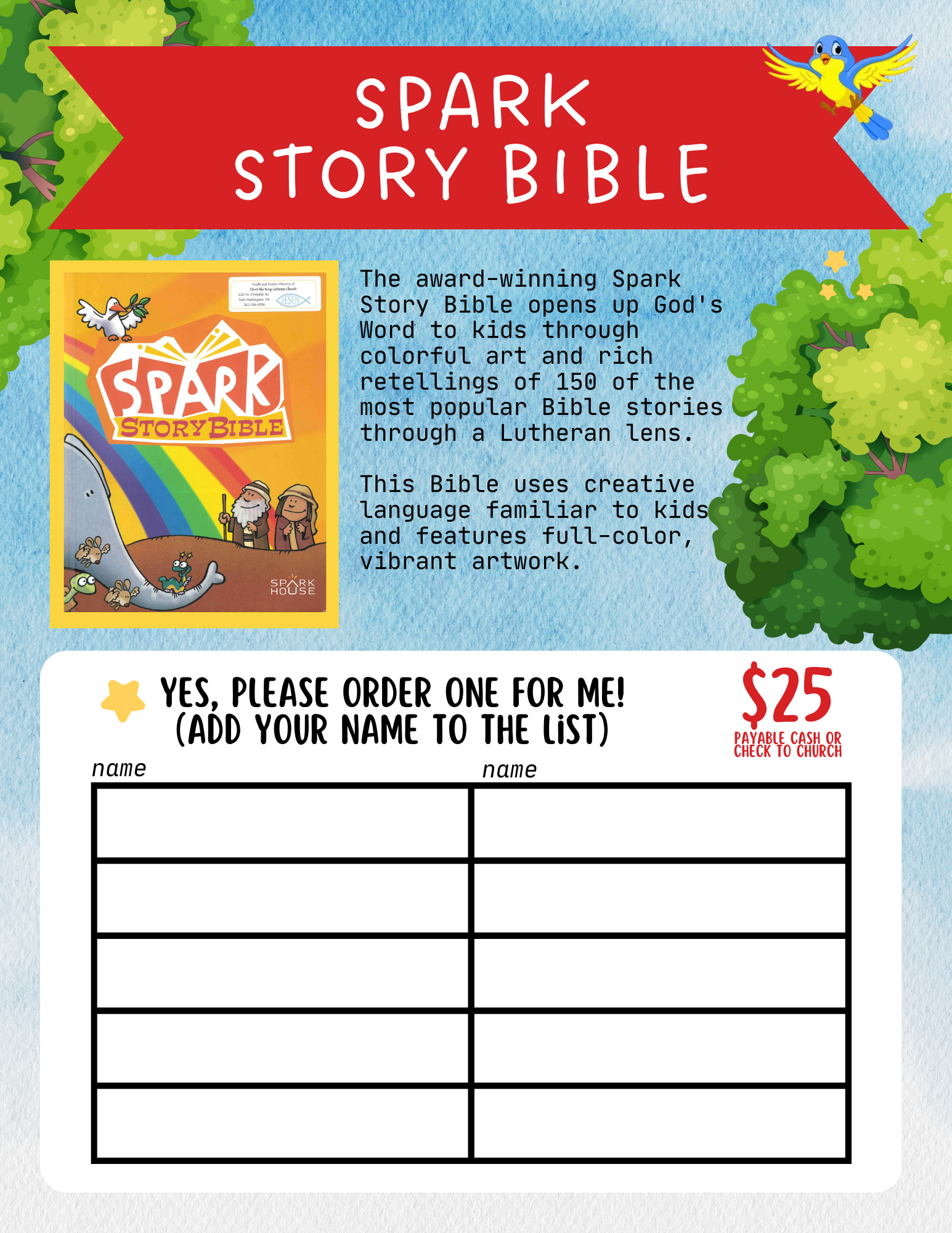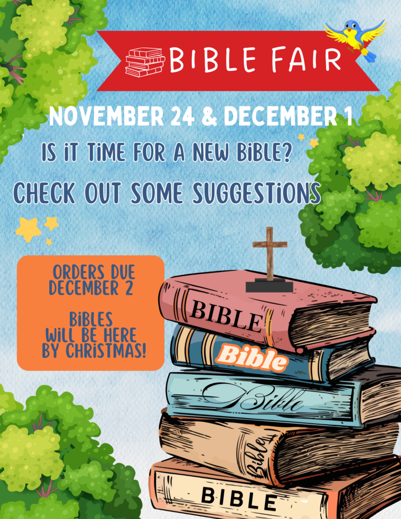 For the next two Sundays we are holding a Bible Sale, inspired by the Scholastic Book Fair! We have a variety of Bible styles available for you to browse and purchase. If you’d like to order one, simply add your name to the list. All orders must be submitted by December 1. Maybe you already have a bible at home, but this could be a great opportunity to update it or purchase a bible for a loved one as a special Christmas gift.