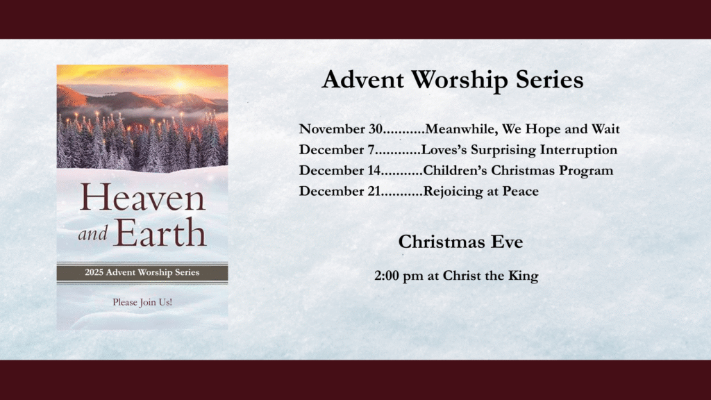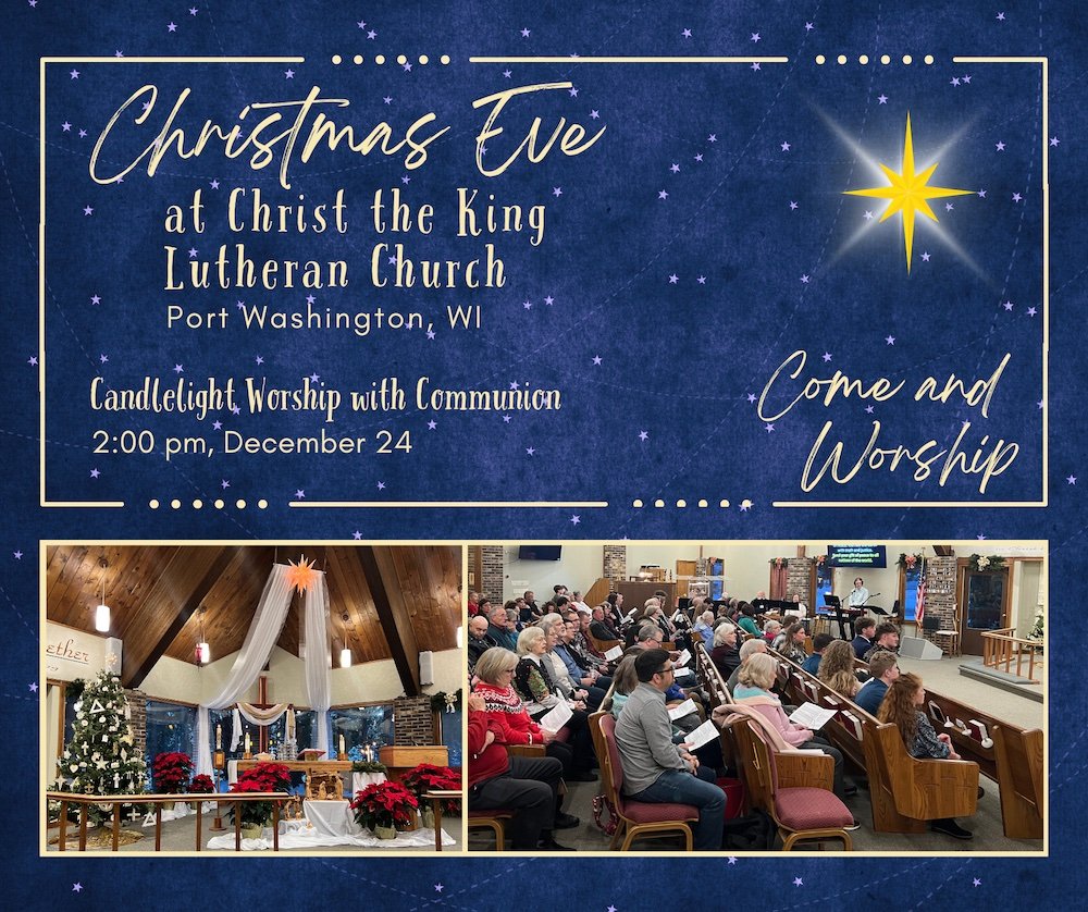 Celebrate the story of Jesus’ birth! If you’re in the Port Washington area and looking for a place to celebrate Christmas, we invite you to join us for Christmas Eve worship at 2:00 pm on December 24 here at Christ the King Lutheran Church. Christ is born for you, and there’s a place for you here.