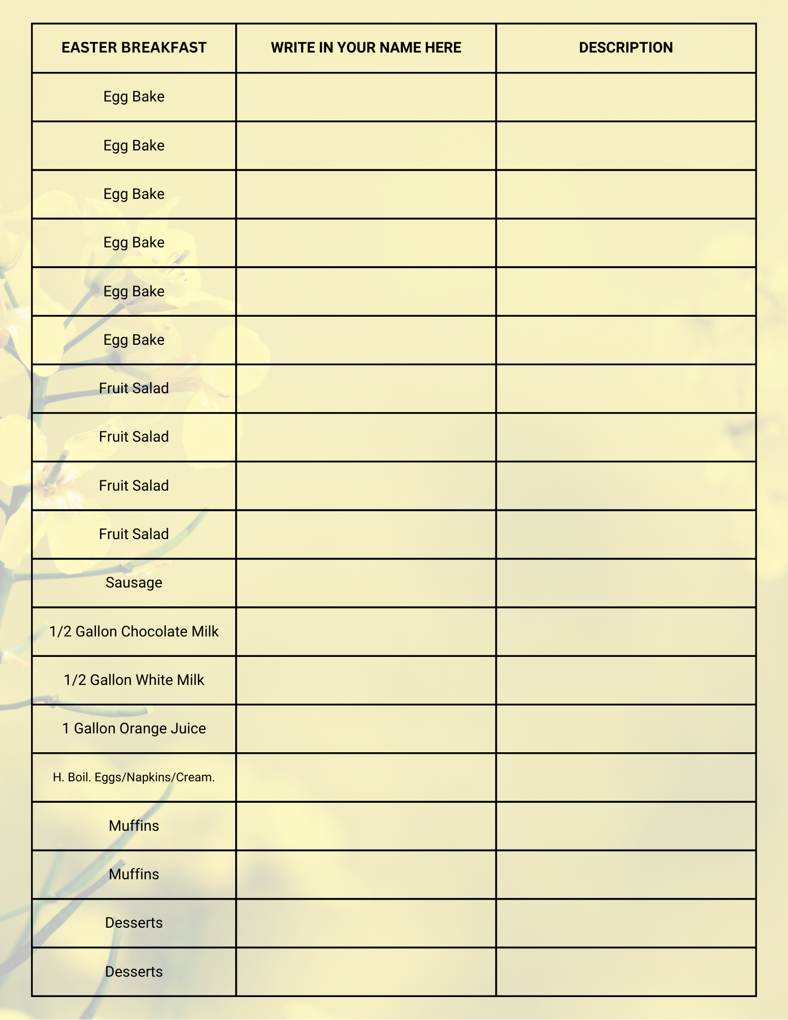 If you would like to bring a dish to pass you can signup at the Usher Table at church or call the church office at 262-284-5411. Here is the list of dishes needed.
