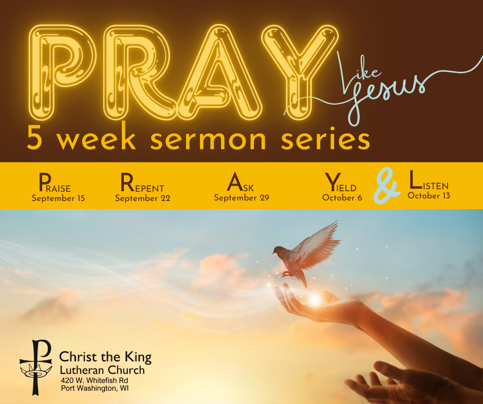 Our five week PRAY Like Jesus sermon series begins Sunday, September 15 at our 8:30 AM worship service. Join us as we explore the familiar words of the Lord’s Prayer as a model for our own prayer life. Each week, we’ll delve into a different segment of the Lord’s prayer, looking at prayer through the model of Praise, Repent, Ask, Yield, and listening for God’s response. Don’t miss this opportunity for spiritual growth and insight! Check out the theme highlights for each week below.